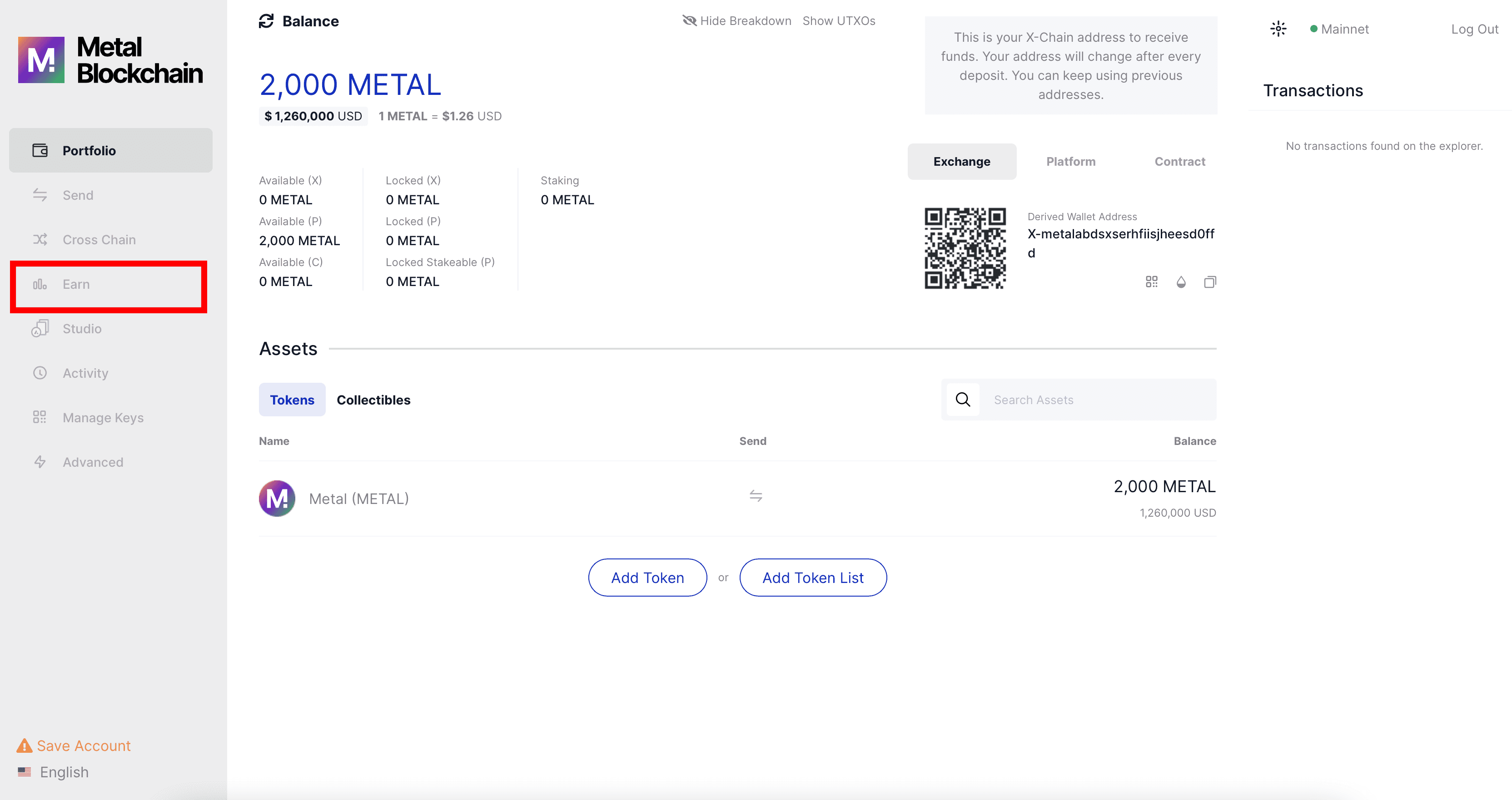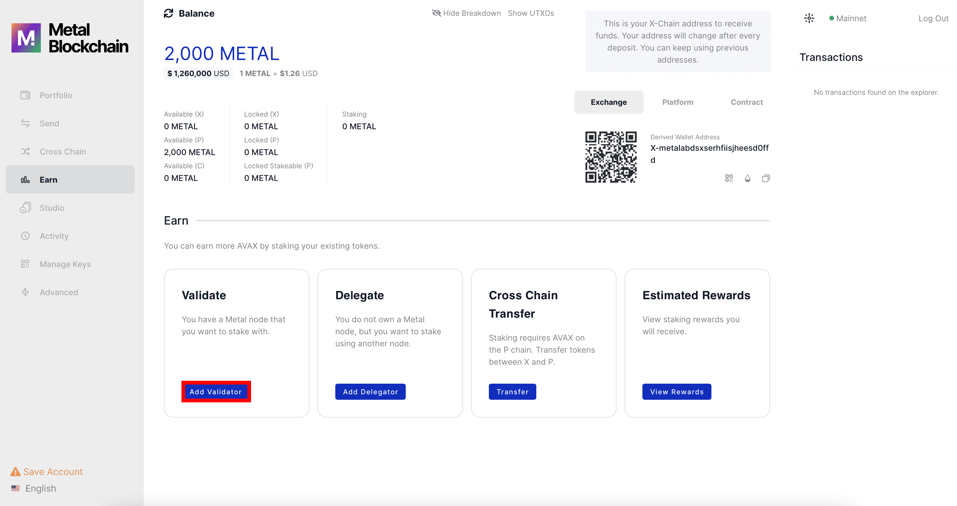 Step 2: Make sure you have at least 2000 METAL available on the P chain and click on the Earn tab on the left menu. If you need to transfer between chains first, the steps are covered in Chapter 06: How to transfer cross-chain in the Metal Wallet of the Metal Wallet's guide section.