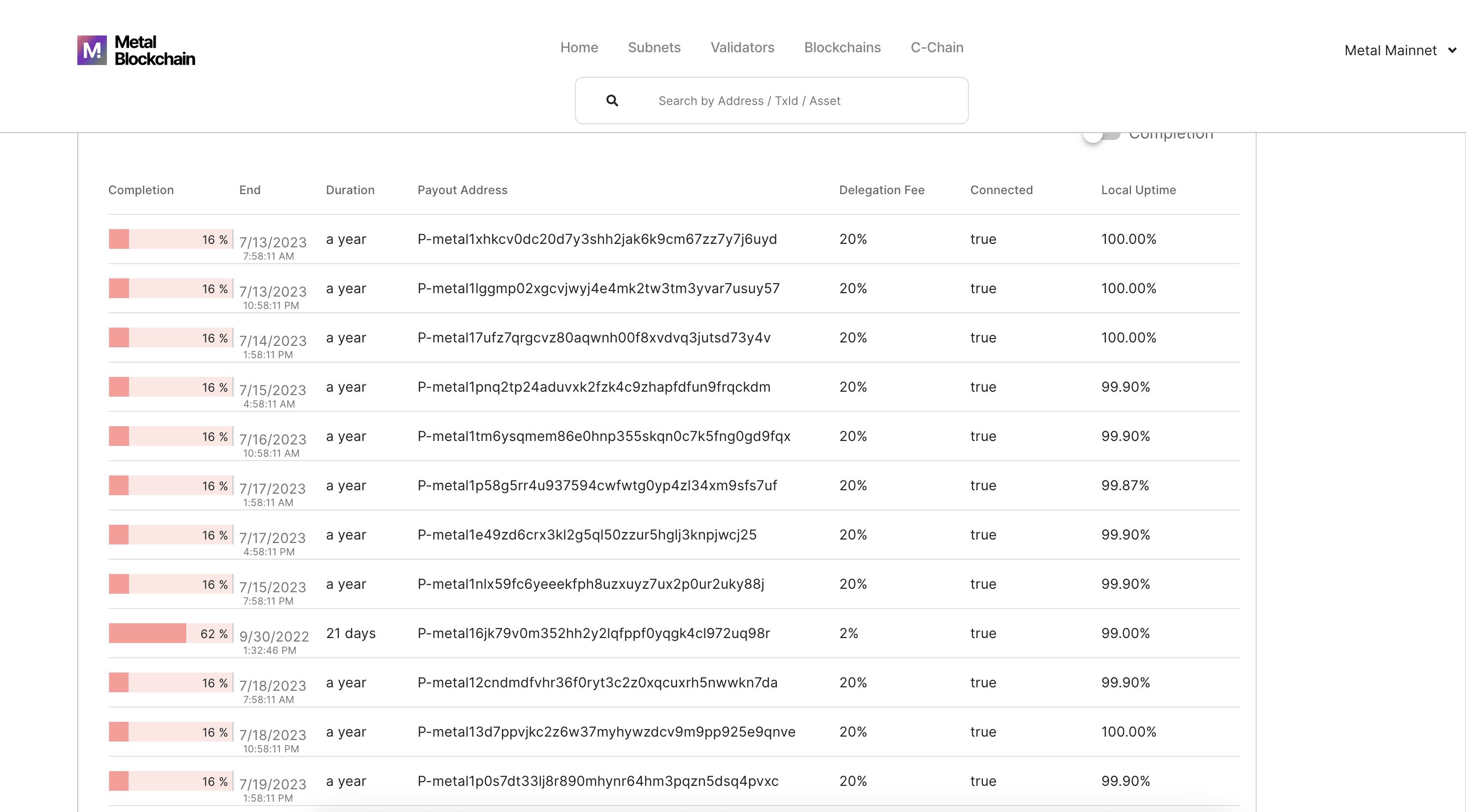 Congratulations, you are now staking your METAL as a validator! You can track the progress and view the estimated rewards on the EARN tab > View Rewards button at any time. Important: If you don’t meet 80% uptime at the end of his staking period, the validator nor its delegators will be able to earn staking rewards. You can track validator uptimes here, in the local uptime section as seen in the picture below.