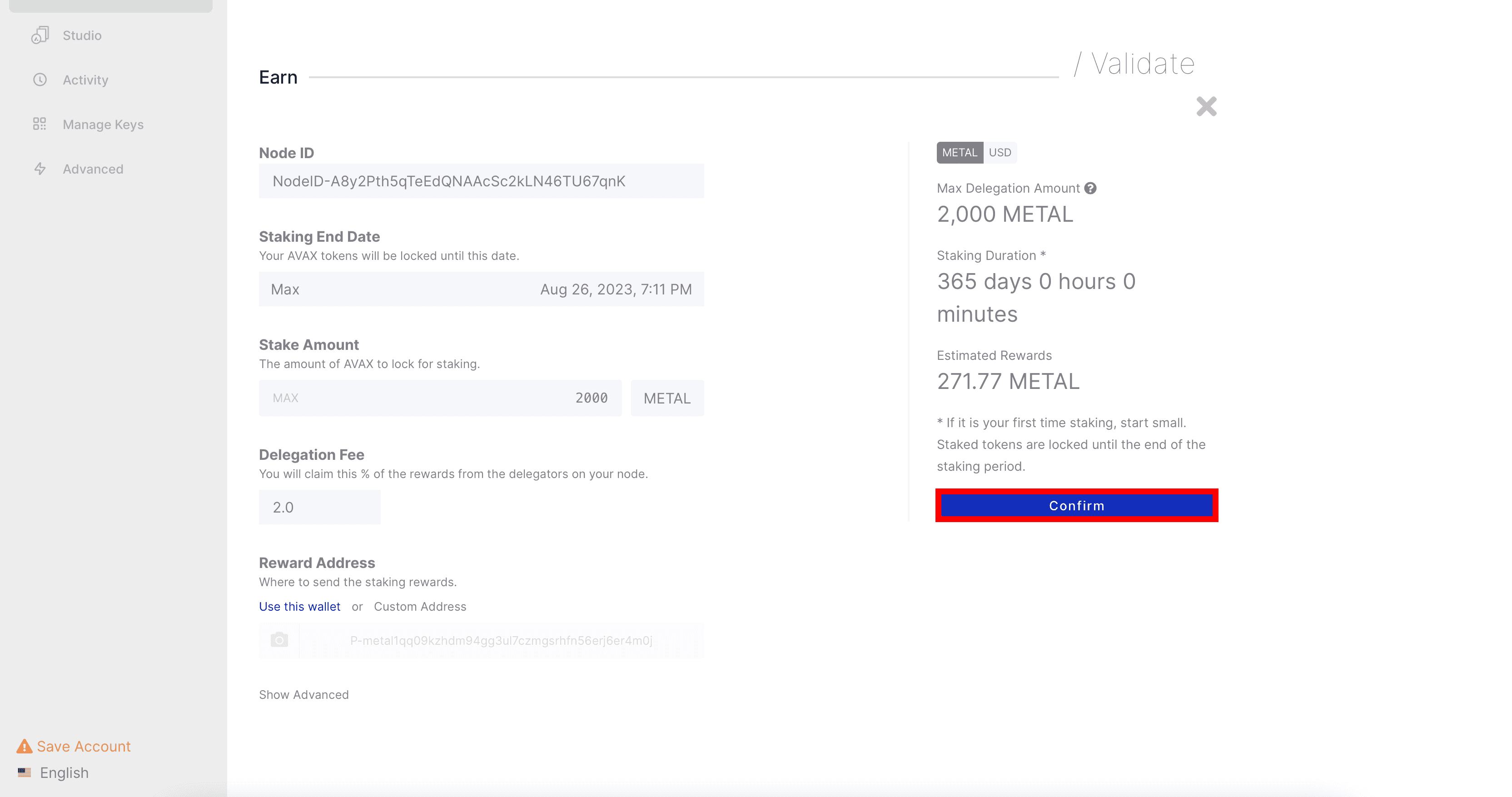 Select your desired end date. The minimum duration is 14 days. The maximum duration is 1 year (365 days). Next, enter the amount you want to stake (2000 METAL minimum). Important: once you staked, you can not add more METAL to the validator node for the duration that you staked. Lastly, select the delegator fee and click on the Confirm button. You will be asked to confirm again, if everything looks ok, click on Confirm again to finalize.