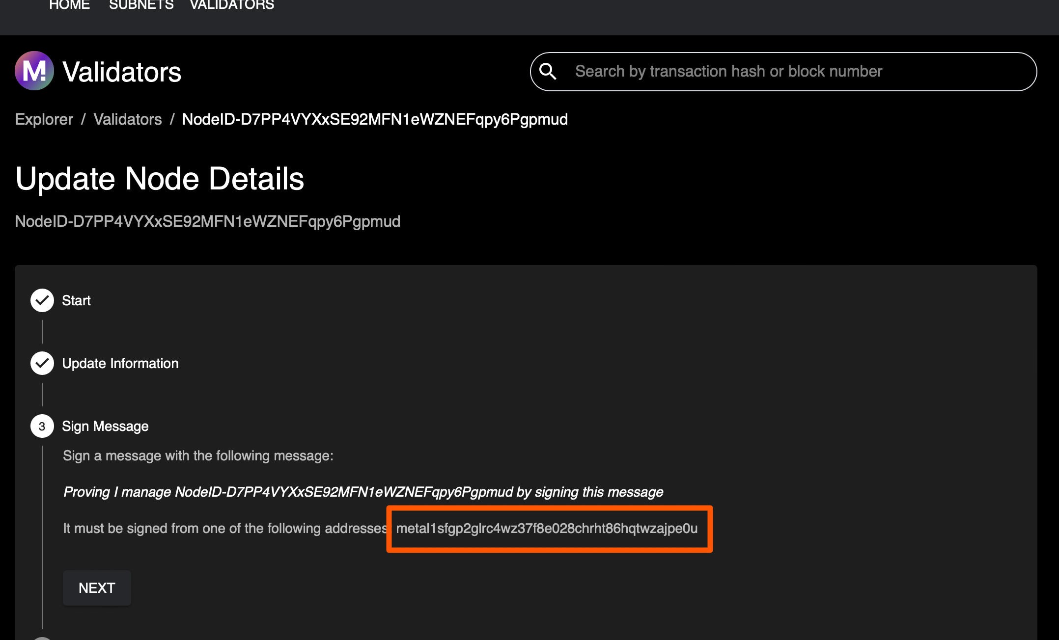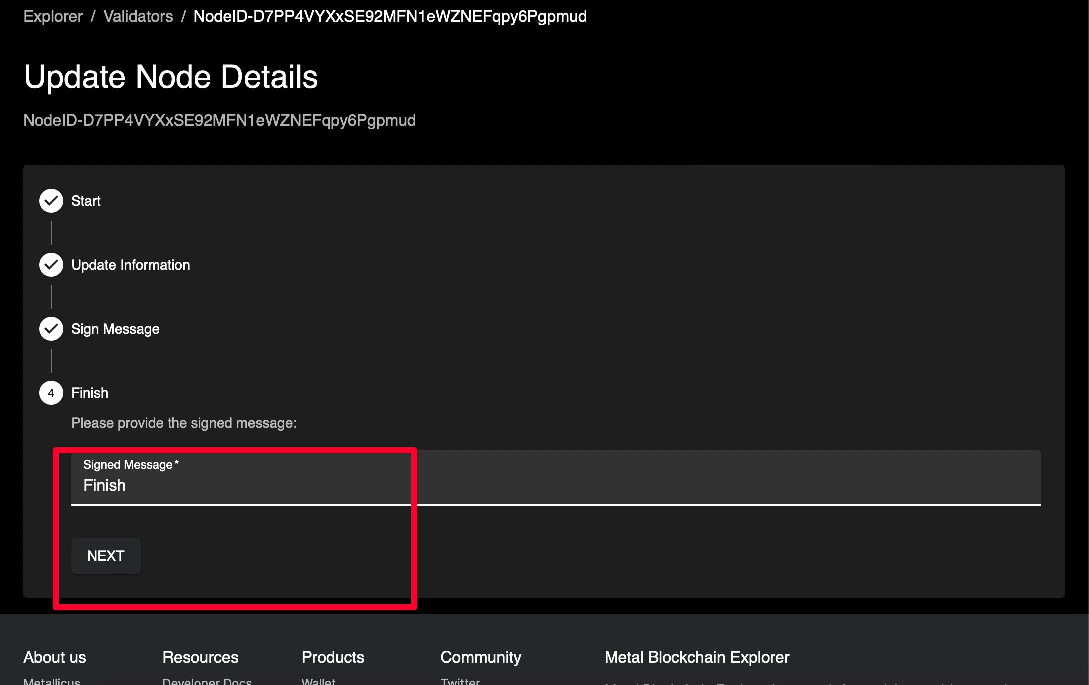 Step 11: You will see the signed message in the wallet, copy it and paste it on the validator page, then click the Next button.
