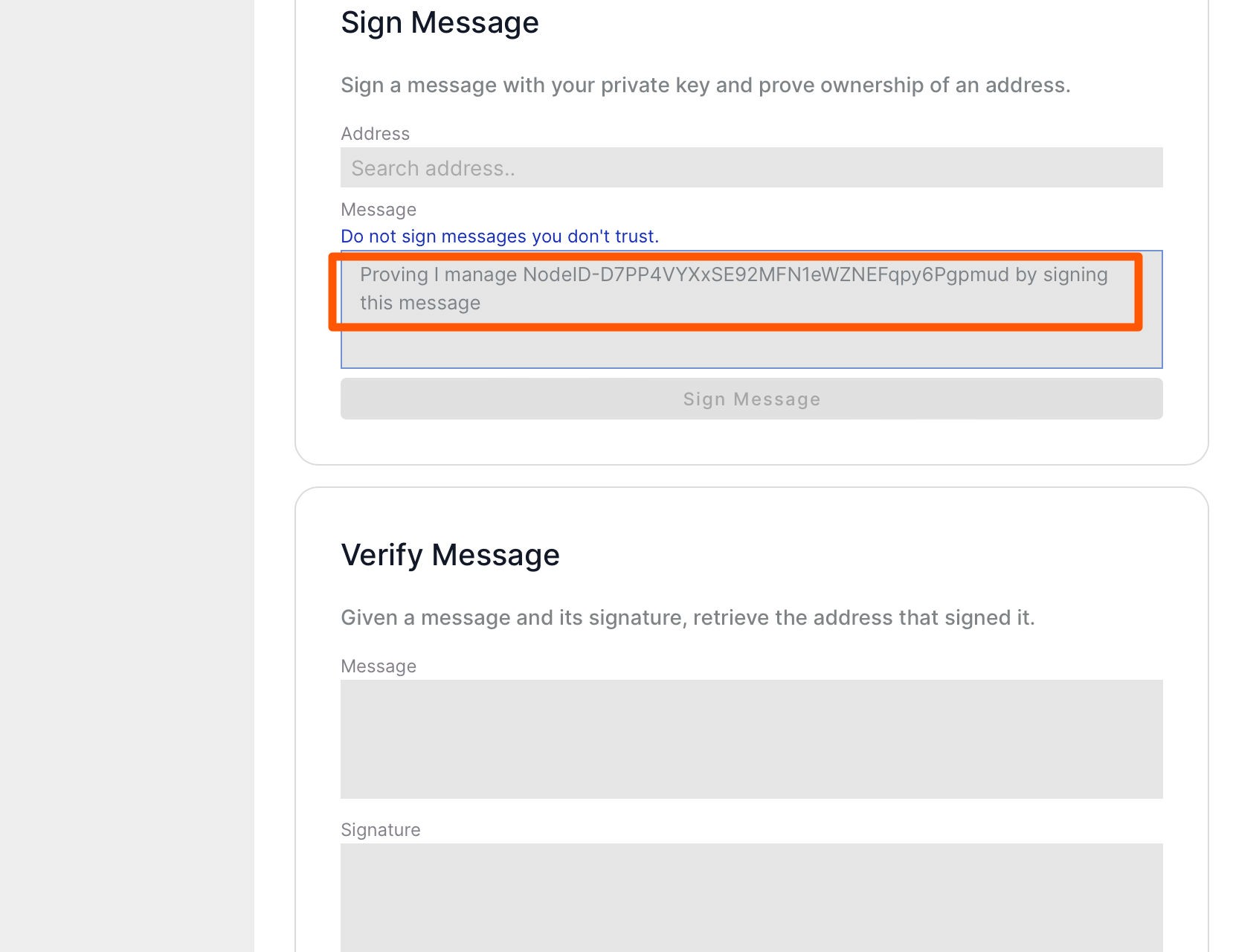 Step 8: Open your Metal Wallet, go the advanced tab and scroll down till you see the Sign Message section and paste the Proving I manage this Node-ID message from the previous step.