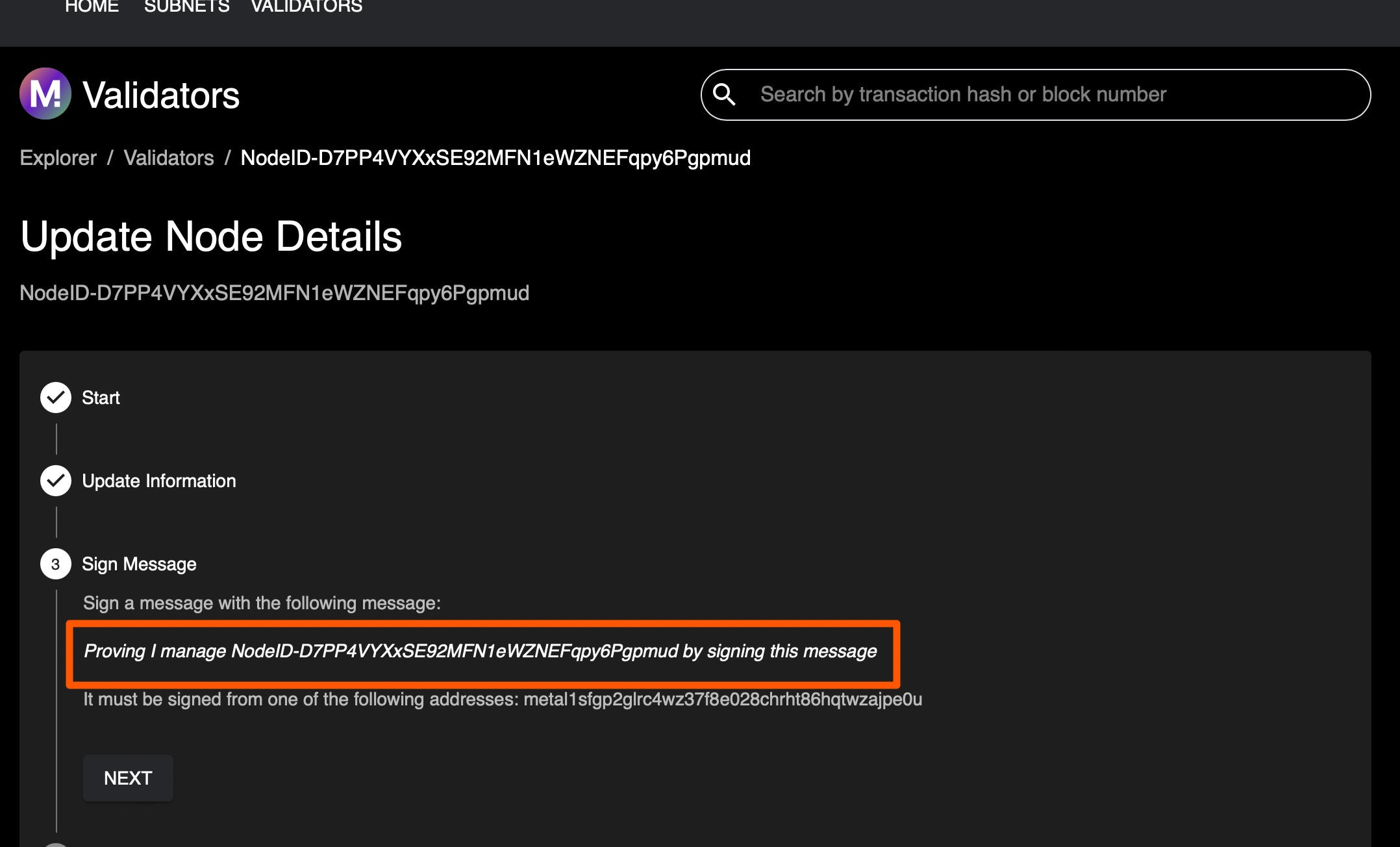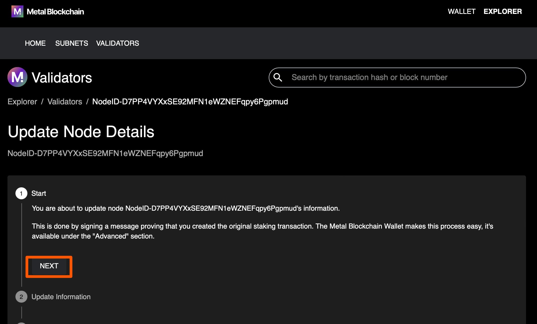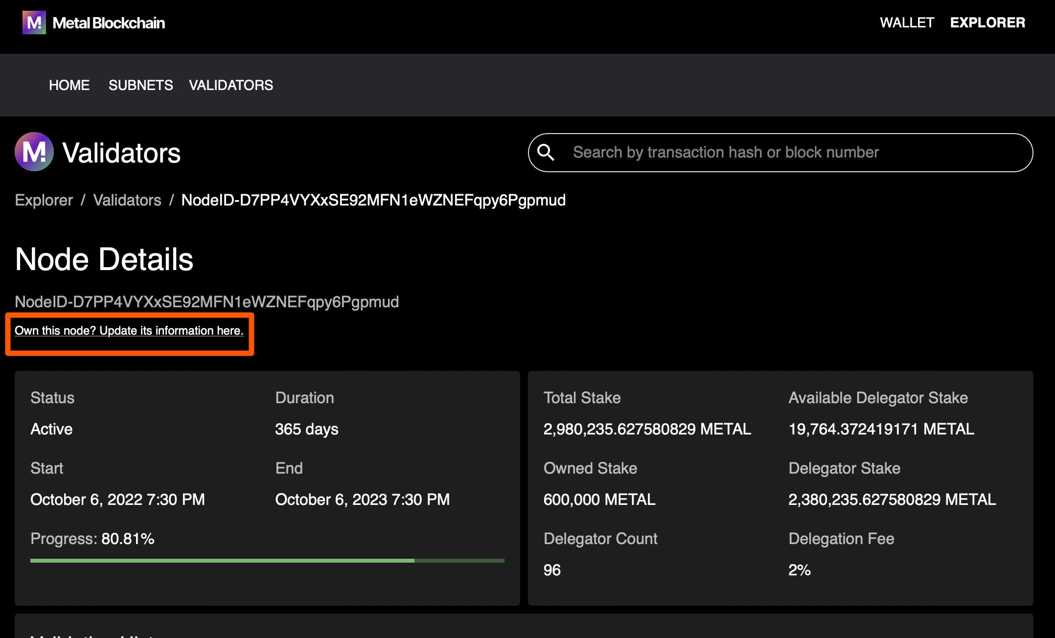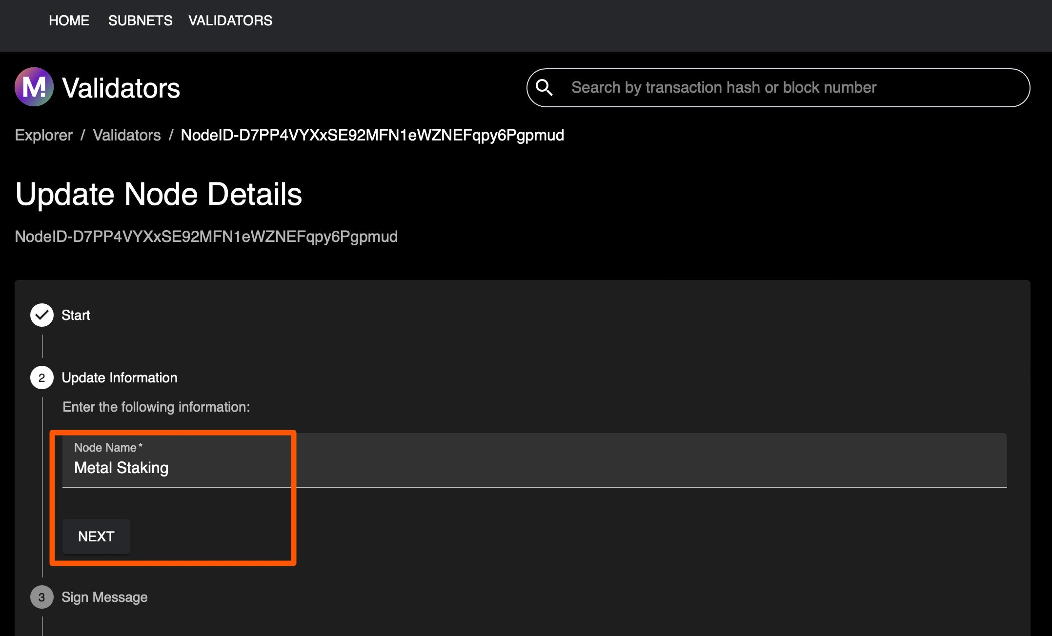 In this chapter, you’ll learn how to update your node name so that it becomes visible on the Metal Blockchain Explorer and wallets.